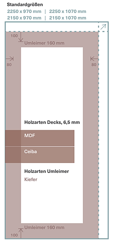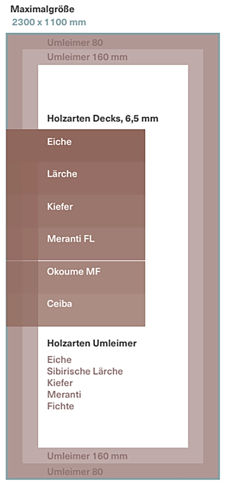 CLIMAPORTA Türrohlinge können auf Bestellung in frei wählbaren Größen und allen gängigen Sperrholzoberflächen geliefert werden. Maximale Größe 2300×1100 mm.