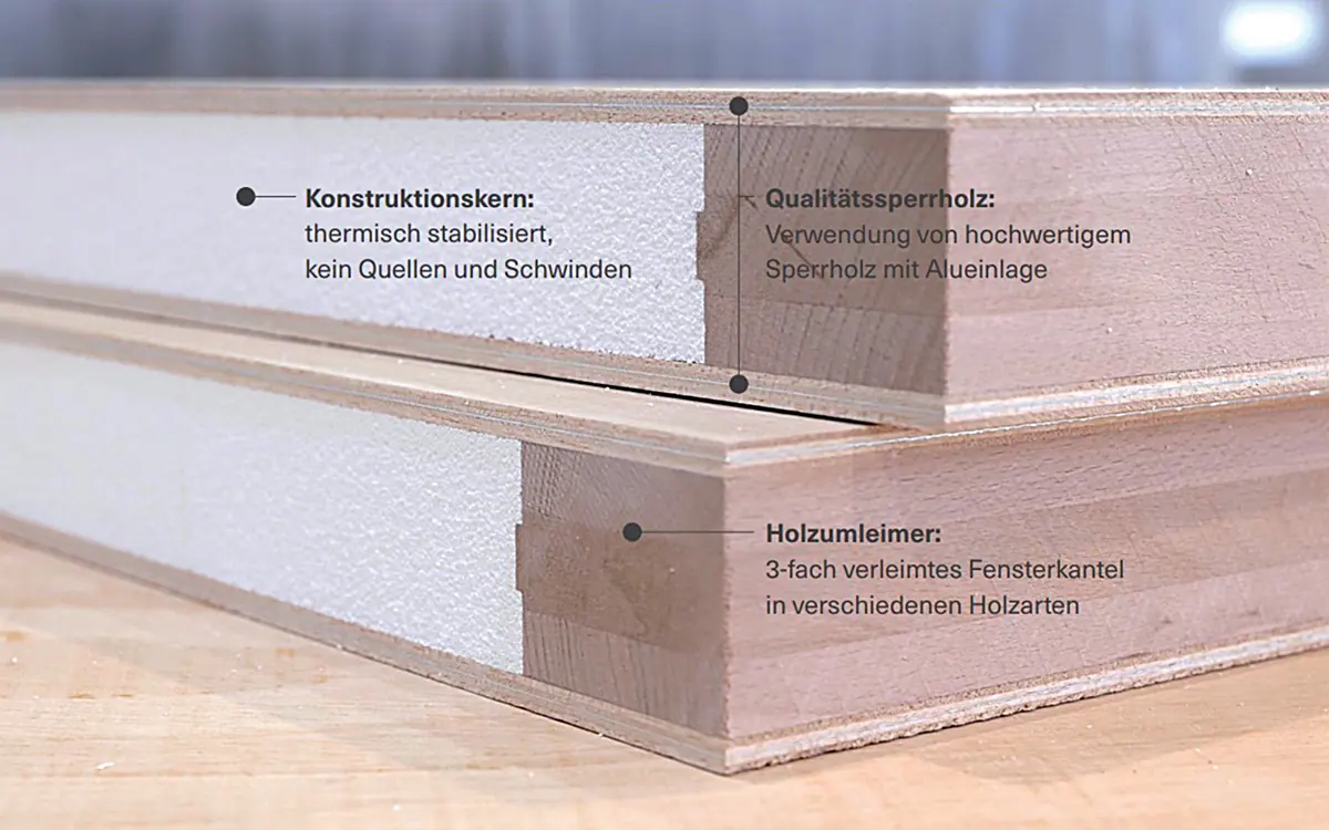 Der Konstruktionskern ist thermisch stabilisiert, somit entsteht kein Quellen und Schwinden bei Veränderung von Temperatur und Feuchtigkeit.