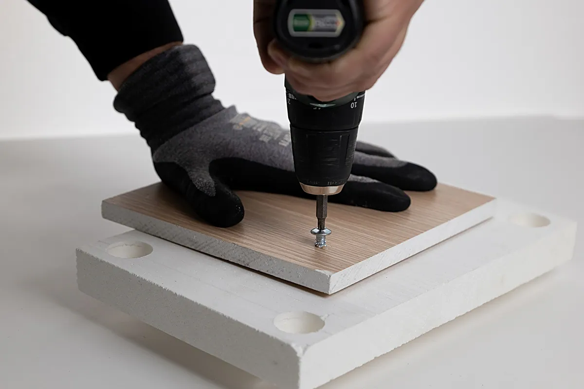 COMPACFOAM hat ein vergleichsweise geringes Gewicht. Das erleichtert das Handling. Und trotzdem ist COMPACFOAM so fest, dass ein kraftschlüssiges Verschrauben mit handelsüblichen Holzschrauben ohne Vorbohren kein Problem darstellt.