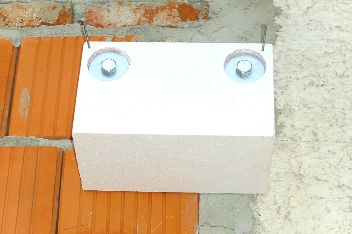 Besonders bei Klappläden wirken unglaubliche Kräfte auf die Unterkonstruktion ein. Elemente müssen dauerhaft stabil, druckfest und vor allem gut dämmend sein. Selbst bei sehr hohen Fassadendämmstärken erfüllt der COMPACFOAM Montageblock diese Anforderungen. Der Montageblock wird mit Kleber direkt an der Wand als Element des Vollwärmeschutzes angebracht. Zur Befestigung der Markisenkonsole werden Bolzenanker oder eine Gewindestange durch den Montageblock in der tragenden Wand verankert.